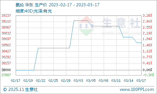 根据生意社监测显示,本周(3月11-16日)国内氨纶价格走跌,截止3月14日40D规格市场均价在38625元/吨,较周初下跌0.96%,同比下跌31.64%。氨纶行业开工仍保持8成以上高位运行,现货供应稳定。下游按需采买,观望情绪较浓,氨纶市场销售节奏较上周有所下滑。