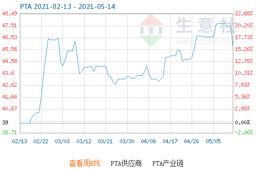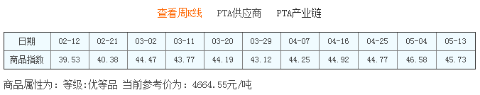 5月13日PTA商品指数为45.73,较昨日下降了1.86点,较周期内最高点103.92点(2011-09-15)下降了55.99%,较2020年04月22日最低点30.09点上涨了51.98%。(注:周期指2011-09-01至今)